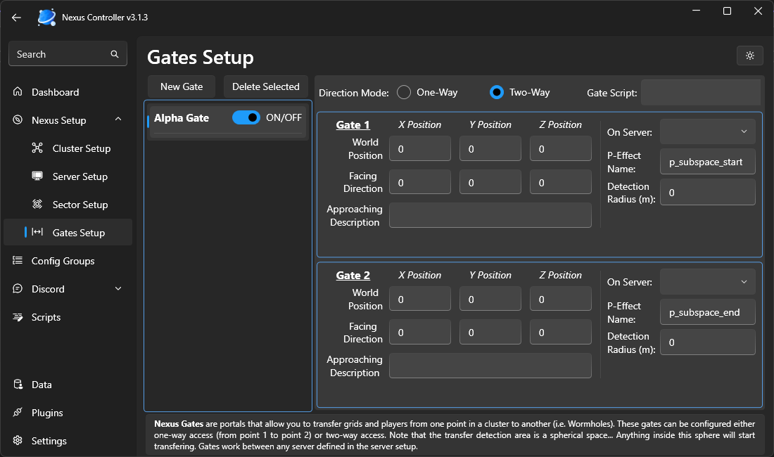Gates are wormholes that allow players and or grids to be transported between two points. When adding a new gate you can click the ‘New Gate’ button and optionally rename the gate but double clicking the name to the left of the on/off switch.