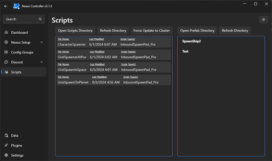 Using the same buttons like the scripts, you can navigate to the controller’s prefab directory. Add any .bp or .sbc file into this folder for grids being used by the scripting system. (Respawn Pads/Transporters/Possible Gates). Clicking the refresh button will re-sync the prefabs in the controller with those in the folder.