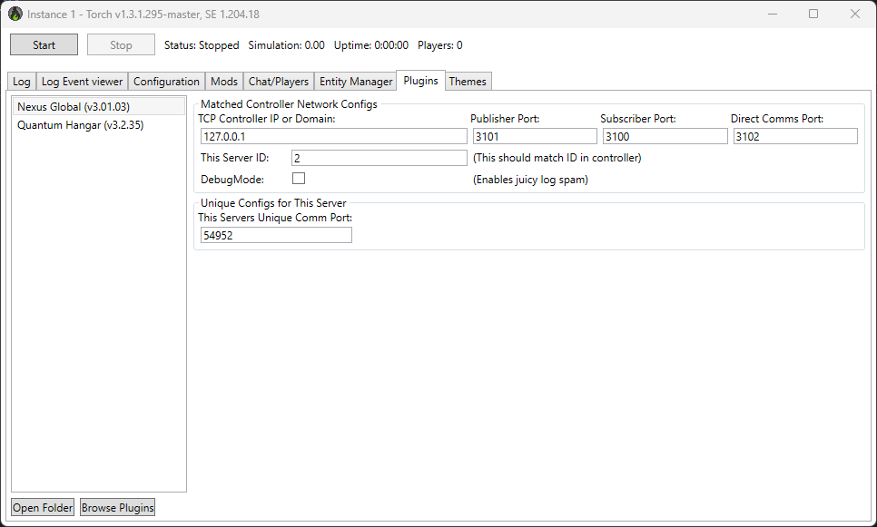 The ‘Unique Comm Port’ is automatically generated on first run with the plugin. You can use the auto assigned port OR pick a unique one yourself. In the controller server config you must make sure you assign this port from the torch server into the config for that server.